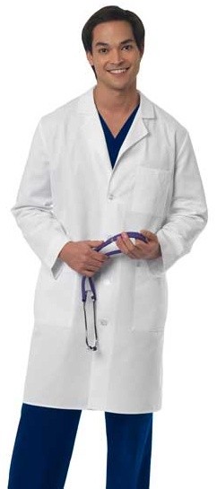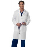 Mr. Barco Men's 38" Twill Lab Coat - Style 9103 - 38" length 3 pockets - Chest pencil pocket detail - Side slits for pant pocket access - 4 button closure - 65% Polyester / 35% Cotton Twill. Color: White.